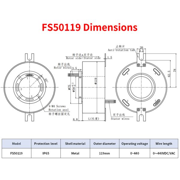The FS50119 series waterproof rotary conductive slip ring has a center hole size of 50mm, an outer diameter of 119mm, 24 channels supporting multi-channel parallel transmission, an impact-resistant metal shell, and an insulation resistance of ≥1000MΩ. It is suitable for heavy-duty equipment such as mining machinery turntables and large water conservancy gate rotation mechanisms.